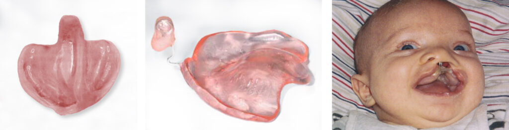 Säuglinge mit Gaumenspalten bekommen gleich nach der Geburt eine sogenannte Trinkplatte. Dieses Trinkplättchen ist mit einer Zahnspange vergleichbar und wird auch im gleichen Verfahren hergestellt. D. h. der Arzt nimmt einen Abdruck vom Gaumen und der Zahntechniker erstellt ab dieser Vorlage eine entsprechende Trinkplatte. Die ersten Trinkplättchen sind noch ganz weich. Die folgenden Plättchen sind dann wirklich mit Zahnspangen vergleichbar. Aufgrund des schnellen Wachstums der Babys müssen die Platten laufend angepasst werden. Mit der Zeit wird dem Plättchen ein sogenannter Nasensteg zugefügt. Das ist eine Art Dorn mit runder «Spitze», welcher vom Trinkplättchen ins Nasenloch der abgeflachten Nasenseite reicht. Damit wird das Nasenloch angehoben und die Nase «in Form» gebracht.
