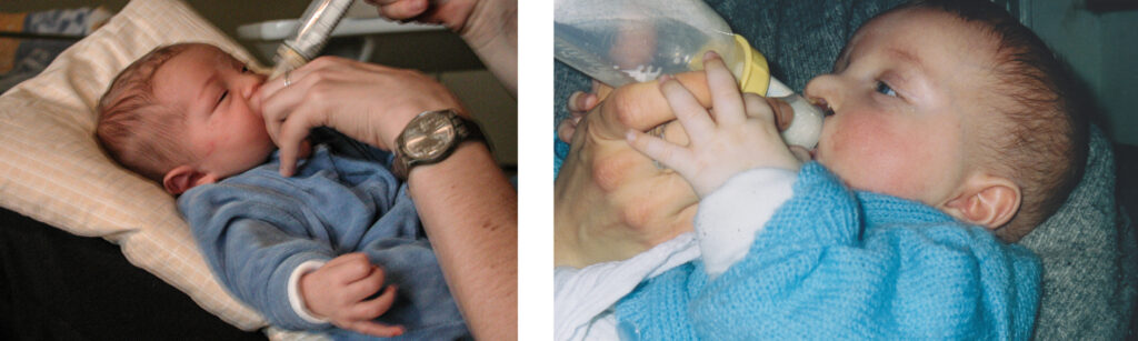 Nach der anfänglichen, tröpfchenweisen Fütterung mittels einer Spritze, bringt der Haberman-Sauger erhebliche Erleichterung bei der Nahrungsaufnahme.
