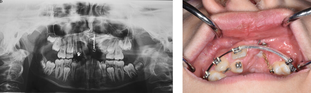 Ansicht der Zahnstellung nach Extraktion aller Weisheitsszähne und Anschlingung des quer liegenden Eckzahns im Juli 2019. (Die Aufnahme entstand im Februar 2020.)